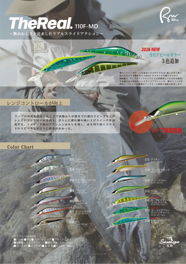 2026年1月より、2026シーズンサクラマス用インジェクションミノー、【ザリアル110F-MD】が販売開始いたします。